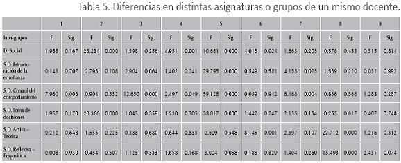 Los datos muestran que la subdimensión en la que los docentes son más estables es la subdimensión reflexiva-pragmática donde solo uno de los nueve docentes muestra diferencias significativas dentro de asignaturas o grupos en los que imparte la clase. Le siguen las subdimensiones estructuración de la enseñanza, toma de decisiones y activa-teórica, en las cuales dos de los nueve docentes muestra diferencias significativas en sus grupos.
