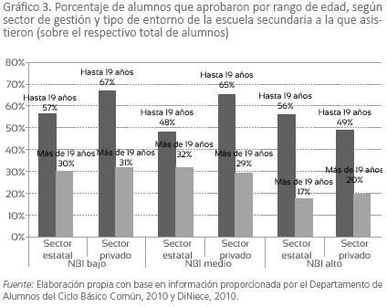 Con respecto a la edad, como se presenta en el gráfico 3, se advierte que entre los alumnos menores de 19 años existe un mayor porcentaje de aprobación que entre los de mayor edad. A su vez, se observa que los alumnos de menor edad que asistieron a escuelas secundarias de gestión privada ubicadas en contextos menos desfavorables presentan mayores porcentajes de aprobación (el 67 % de los alumnos en radios censales con NBI bajo -el restante 33 % de este grupo no aprobó o tiene calificación ausente- y 65 % en radios censales con NBI medio) que los alumnos menores de 19 años que asistieron a escuelas emplazadas en radios censales similares pero de gestión estatal (57 % en radios censales con NBI bajo -43 % no aprobó o tiene calificación ausente- y 48 % en radios censales con NBI medio). Sin embargo, entre quienes asistieron a escuelas localizadas en entornos con alto nivel de pobreza estructural la asistencia a establecimientos de gestión estatal por parte de los menores de 19 años resulta más beneficiosa que la asistencia a establecimientos de gestión privada (56 % y 49 % respectivamente).