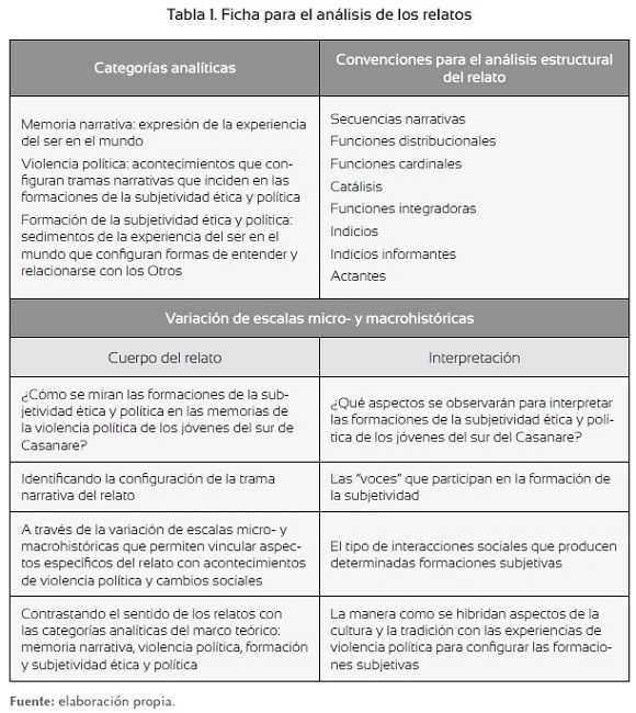 Para este efecto, se tuvo en cuenta la perspectiva básica de análisis estructural del relato que sugiere Roland Barthes (1977), los aspectos de la tradición, la cultura y la historia que constituyen el mundo social tanto de los sujetos como del investigador, y las categorías analíticas de memoria narrativa, violencia política y formación de la subjetividad ética y política. De esta forma, se trata de dar sentido al concepto de arco hermenéutico de Paul Ricoeur, cuando menciona que la explicación es la base de la comprensión, y que el mundo de la vida es el primer y último donante de sentido de la experiencia.