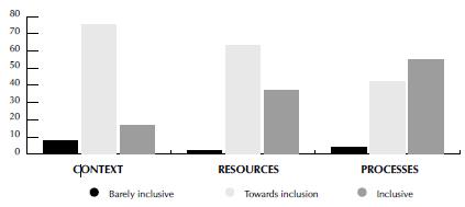 The profile "barely inclusive" was scored low in the three dimensions considered (contexts, resources and processes), while "towards inclusion" was scored highest for contexts and resources, and "inclusive" for processes. The conclusion in this respect is that the schools in this study and the teachers responding are in the main on the way towards inclusion. This is encouraging but it makes clear too that work is still necessary to get the "inclusive" profile into first position for all the dimensions.