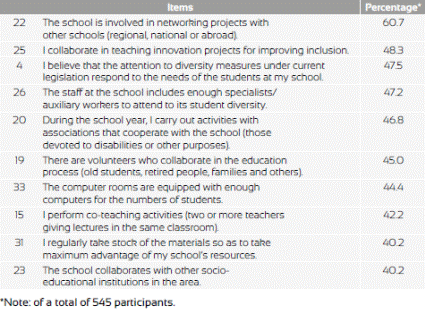 The weaknesses found lie in the dimension of contexts (items 4, 15, 19, 20, 22 and 23) and resources (items 25, 26, 31 and 33). The weaknesses reflect no networking between schools at any level; a poor teacher participation in projects linked to inclusion; and a strong disagreement with the means available under current law to address attention to diversity. Other weaknesses that appear are the need for more specialists to attend to diversity, for tighter bonds between associations and for the involvement in the school of stakeholders related to volunteer groups. Teachers also indicated that there were insufficient computer stations for all students and that co-teaching activities were scarce. The lowest percentage was for the inventories of materials that are not made periodically and the scarce collaboration with other institutions in the surrounding area.