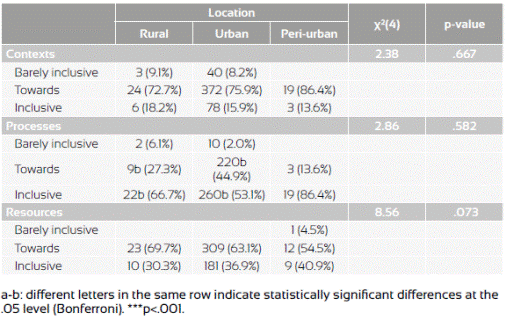Finally, some statistically significant differences were observed for processes and resources according to the type of school, with a more optimistic perception of inclusion being shown by teachers in private schools than in state schools. This is different to the findings of research by León and Arjona (2011) in private schools in Andalusia, which reported insufficient resources for inclusion that did not adapt to the students' needs. There were no significant differences for location. However, the results obtained in the study of Callado, Molina, Pérez, and Rodriguez (2015) demonstrate that rural areas do not take full advantage of the context they are in to favour inclusion processes and continue to develop proposals that are merely integrative. To conclude, differences were observed within the inclusive profile for the three dimensions in secondary schools compared to nursery and primary, indicating that these are more inclusive than secondary schools. This is in agreement with Bravo (2010), who reported that there were more inclusive practices in primary than secondary schools.