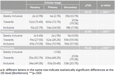 The table above shows that within the inclusive profile there are statistically significant differences for the three dimensions during secondary schooling, where the lowest percentage is for contexts (7%), followed by resources (20.7%), and processes (37.5%). In this case, it was nursery and primary school teachers who perceived their schools to be more inclusive than secondary school teachers did, with the latter rating the practices in their schools lower in all the dimensions.