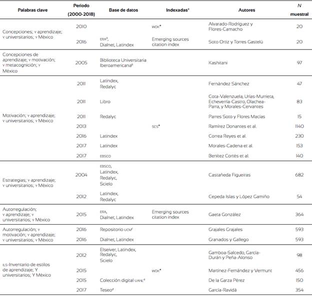 Respecto a la segunda categoría, esto es, los estudios que han aplicado el modelo de patrones de aprendizaje de Vermunt, solo se hallaron dos artículos publicados (Gamboa-Salcedo, García-Durán y Peña-Alonso, 2012; Martínez-Fernández y Vermunt, 2015), una tesis de maestría (De la Garza Pérez, 2015) y una tesis de doctorado (García-Ravidá, 2017).