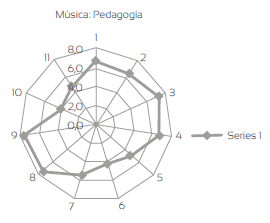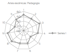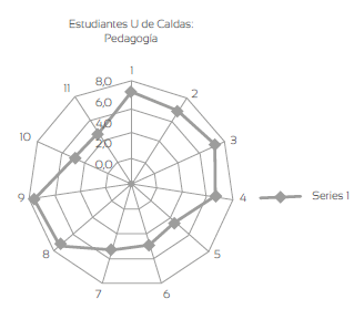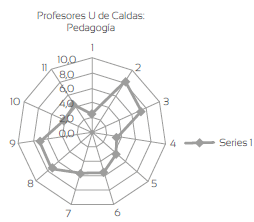 Las figuras 1 y 2 representan cómo valoran la pedagogía estudiantes y profesores de la Universidad de Caldas. En el exterior, numerados de 1 a 11, aparecen los ítems y en el tejido, de adentro hacia fuera, de 0 a 10, el valor que a cada uno de ellos otorgaron los sujetos.