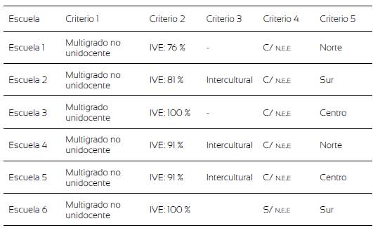 Los criterios incluyeron distinciones en 1) el tipo de estrategias de enseñanza, es decir, escuelas multigrado o de curso combinado unidocente o no unidocente; 2) el Indice de Vulnerabilidad Escolar (IVESINAE) que determina, mediante diversas variables, un porcentaje de estudiantes vulnerables por establecimiento; 3) el tipo de proyecto educativo, diferenciando aquellos en que se establece explícitamente un proyecto educativo intercultural de las que no; 4) las N.E.E que se traduce en si el establecimiento cuenta con PIE. Si bien comprendemos la inclusión escolar como un proceso que va más allá de la integración de niños y niñas con N.E.E al sistema educativo, consideramos este criterio como relevante en la medida en que ha sido incluido como posibilidad para la escuela rural. Y 5) la ubicación en el territorio nacional, en que se diferenciaron tres categorías generales: norte, centro y sur con el fin de incluir distintas condiciones contextuales.