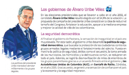 Aparte de la construcción de este chivo expiatorio, la reorientación afectiva contó con otro mecanismo que, desde nuestro análisis, logró configurar un "nuevo mapa afectivo de la política" y fue la presentación reiterada, ante la opinión pública, de la idea de que la historia, y en general el conjunto de disciplinas de las Ciencias Sociales en el país, han estado altamente ideologizadas. La negación del conflicto armado, en este estado de cosas, requería de una nueva forma de elaborar y presentar el análisis histórico y político, como de hecho se presentó años más tarde en una versión de la seguridad democrática consignada en un texto escolar de la Editorial Santillana para alumnos de quinto grado (Figura 1). Lo significativo aquí no es solo que se tratara de generar una nueva versión de la historia reciente, sino de exhibir a la política de seguridad democrática como algo necesario e inevitable para el país, soportado por estudios técnicos que mostraban la viabilidad y la pertinencia de este modelo para el "rencauzamiento institucional del país".