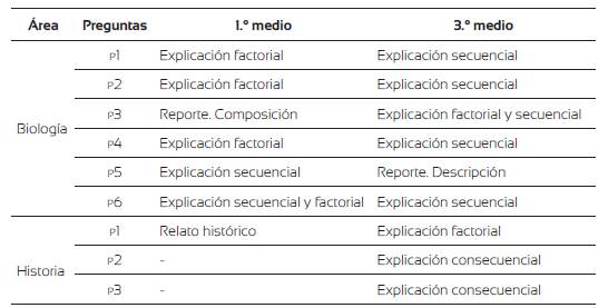 Se observa que los géneros pedagógicos de la historia se concentran en la comprensión de procesos y tienen como propósito primordial informar al lector acerca de esta comprensión de los hechos aludidos. Las preguntas de estos niveles se centran en el qué (la evolución del mundo rural, la doctrina de seguridad nacional, el proyecto de refundación política del régimen militar) y en el porqué (la supresión del Estado de derecho). De esta manera, el profesor está evaluando el manejo que los estudiantes tienen de la información entregada, aunque no por ello queda absolutamente fuera el carácter interpretativo de los hechos relatados o explicados. De manera casi indisociable, y quizás desde niveles anteriores a primero medio, los estudiantes no solo exponen los hechos sino también dejan entrever alguna valoración sobre estos. En efecto, como señala Moyano, un aspecto relevante en el discurso de la historia es la construcción de la valoración, que "implica no solo la evaluación de hechos y participantes, sino también la construcción de acuerdos y desacuerdos con otros hablantes e, incluso, con los lectores"(2013a, p. 68).