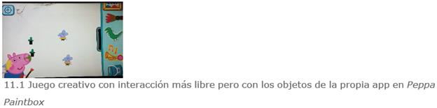Todas las apps analizadas presentan un diseño cerrado, donde el usuario solo puede interactuar con los objetos allí presentes. Los contenidos y respuestas posibles son también cerradas. Las apps de juego creativo y simulación permiten una interacción algo más libre que aquellas basadas en actividades de ejercitación y práctica (figura 11).