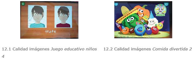 La calidad de las imágenes, gráficos, sonidos, es en general buena, aunque existen importantes diferencias entre las apps analizadas. Juego educativo niños 4 y Juego educativo niños 5 tienen una calidad bastante pobre (imágenes 2D, estáticas, poco detalle, sin escenarios, pocos sonidos, sin música) si la comparamos, por ejemplo, con Comida divertida 2 (figura 12).