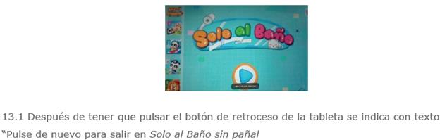 A pesar de que la mayoría de las apps analizadas tienen menús relativamente claros y sencillos (con poco botones, destacados y coherentes entre las pantallas), debemos señalar dos cuestiones: la incoherencia entre apps (con iconos de menú principal que varían entre ellas) y la dificultad de salir de la app (solo en Comida divertida 2 hay un botón identificable para salir, en Juego educativo niños 4 y Juego educativo niños 5 hay una flecha de retroceso, mientras que en las demás no hay botón de salir y/o hay textos) (figura 13).