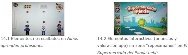 Los elementos interactivos son adecuados, no son excesivos y suelen identificarse con facilidad. Con todo, en algunas apps no se encuentran bien resaltados y en otras se sitúan en la zona de reposamanos (figura 14).