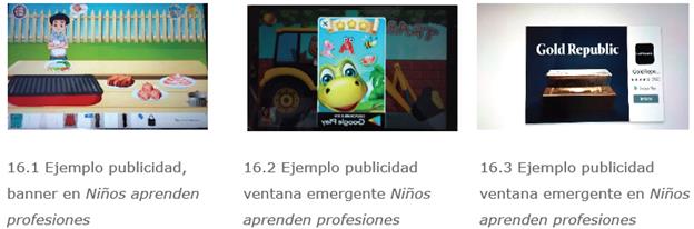 Todas las apps, menos Peppa Paitbox y Toca Kitchen, incluyen un gran número de anuncios en distintos formatos (banner, elementos interactivos, ventanas emergentes). Además, resulta difícil cerrarlos, con botones muy pequeños o textos, y muchos se dirigen al público adulto. Las apps incluyen acceso a otras apps y compras, aunque el acceso a estas últimas está restringido (figura 16).
