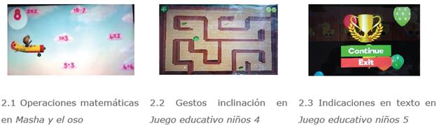 Las apps analizadas son adecuadas a la etapa de educación infantil y, en concreto, a niños(as) de 3-6 años; a pesar de lo cual se pueden encontrar ciertas excepciones en relación con tres aspectos: los contenidos, los gestos requeridos y las indicaciones. En cuanto a los contenidos, en la app Masha y el oso se incluyen actividades con operaciones matemáticas complejas para estas edades o actividades que requieren tener adquiridas las habilidades lectoras y prelectoras como sopas de letras (aunque es importante destacar que en PlayStore esta app se señala como para niños de hasta 8 años). En cuanto a los gestos, uno de los juegos de la app Juego educativo niños 4 requiere gestos de inclinación del dispositivo. En cuanto a las indicaciones, en las apps Juego educativos niños 4 y Juego educativo niños 5 se muestran en texto y en una lengua extrajera (figura 2).