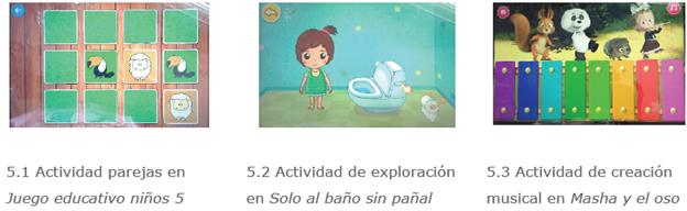 Por otra parte, aunque la mayoría de ellas son adecuadas a la edad de infantil y su contenido responde a algunos de los objetivos y áreas del currículo, no se puede decir que sean innovadoras, ya que se presentan temáticas muy manidas en este tipo de programas (alfabeto, números, operaciones, animales, comida, transportes, profesiones, etc.). Preocupa además que se reflejen sesgos relacionados con el género y que no haya una clara representación de la diversidad social existente. En cuanto a las actividades, no se puede decir que favorezcan la interacción social (salvo con personajes de la propia app), ni el aprendizaje colaborativo, ni que se dirijan al desarrollo del pensamiento complejo (aunque puedan ayudar a trabajar ciertos contenidos de infantil y desarrollar ciertas habilidades). En términos técnicos y de diseño, la crítica más destacable es la dificultad de salir de la app, así como el excesivo número de anuncios. Vemos, por tanto, que los resultados de este estudio coinciden en gran medida con los hallazgos de otras investigaciones (Papadakis et al., 2017; 2018; Özeke, 2018).
