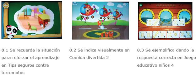 De las diez apps analizadas, solamente Tips seguros contra terremotos presenta cierto acompañamiento e instrucciones relativamente claras junto con una retroalimentación que puede ayudar a entender las causas de los errores. De las nueve apps restantes, El supermercado del Panda bebé, Solo al baño sin pañal y Comida divertida 2 muestran ciertas indicaciones de forma oral o visual para ayudar a completar la tarea. Las restantes no indican ningún tipo de acompañamiento ni indicación (salvo puntualmente en algún juego). Con todo, las indicaciones son ejemplificaciones que dan la solución, pero no ofrecen explicación. Se presenta una retroalimentación basada únicamente en recompensas con estímulos visuales (figura 8).
