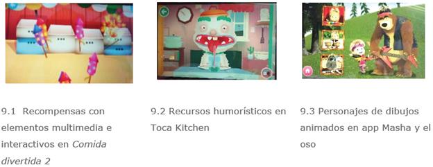 Ninguna de las apps analizadas utiliza estrategias de motivación basadas en el aprendizaje, sino que se favorece una motivación extrínseca basada en recompensas y centrada en la estimulación visual con elementos multimedia atractivos. Otras formas de motivación utilizadas son el humor y la familiaridad (figura 9).
