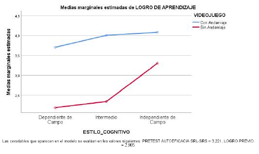 Finalmente, frente a la interacción entre el videojuego y el estilo cognitivo en la dimensión dic, los datos indican que tampoco hay diferencias significativas en ninguna de las variables dependientes. No se registraron diferencias significativas en el logro de aprendizaje (F(2, 44) = 1,05, p = 0,358, η2 = 0,05), como tampoco en la autoeficacia académica (F(2, 44) = 0,66, p = 0,521, η2 = 0,03).
