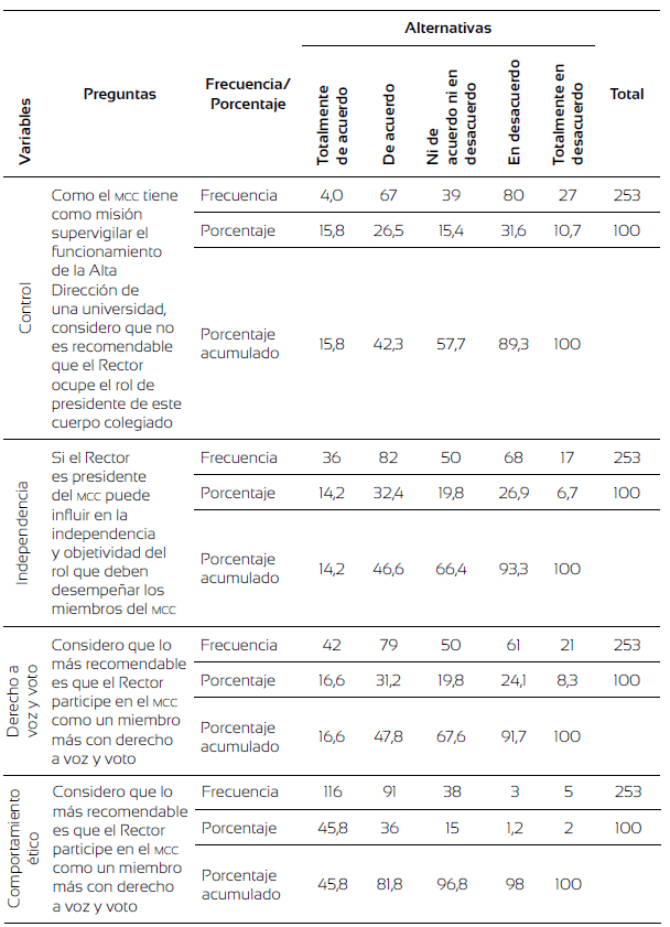 En cuanto al número óptimo de integrantes del MCC, para garantizar eficiencia en la gestión de la universidad, se aprecia que el 52,6% sostiene que debería ser menor a 12 miembros y el 47,4% mayor a 12, lo que refleja una clara paridad de opiniones, tal como se muestra en la Tabla 2.