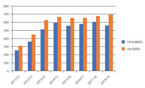 Figura 2 Alumnado matriculado en el Grado de Educación Primaria (2011-2019). Universidad analizada.