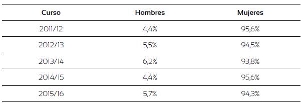Los resultados de dicho estudio demostraron que las tres titulaciones tildadas durante gran parte del siglo XX como "naturalmente femeninas" (Enfermería, Trabajo Social y Magisterio) continuaban presentando porcentajes de alumnado femenino claramente superiores al masculino. En el caso de Enfermería, con un 20,6% de alumnado masculino matriculado en el curso 2016-2017 en esta universidad, algunos factores, como las buenas expectativas profesionales y económicas de dicha titulación de los últimos lustros, pueden explicar el incremento constante de alumnado masculino, aunque los porcentajes están aún lejos del equilibrio. En Trabajo Social, el número de alumnas matriculadas es de un 83,7% (16,3% de alumnos varones), una realidad que sigue demostrando cómo la asociación entre feminidad y servicios, entre ellos el cuidado, siguen constituyendo parte de un ideario asumido e interiorizado que inclina, en la mayoría de los casos inconscientemente, hacia terminadas opciones formativas y profesionales.