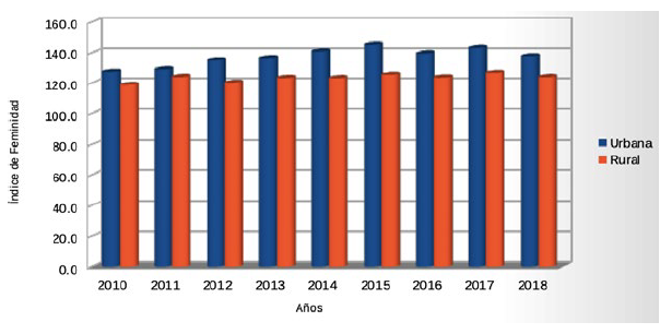 Como puede apreciarse, en los últimos años, tanto en las zonas rurales como en las áreas urbanas, la tendencia mostrada es superior a 100, lo cual indica que la pobreza sigue teniendo mayor incidencia sobre las mujeres.