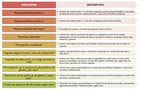 El objetivo es que el índice determine de manera holística y equilibrada el progreso de la mujer en todos los ámbitos vinculados a la participación y desde la equidad como principio económico, social, cultural y político para caminar hacia la igualdad. Todo lo anterior, bajo la premisa de que, en efecto, se aborda un campo "inmensurable" cuando se refiere a la medición de realidades, en este caso, sociales y educativas como la escogida en este trabajo, con lo cual lo que se ofrece es un ejercicio intelectual intencionalmente heurístico y con miras a ser desarrollado más pormenorizadamente en futuras investigaciones. Además, se fusionan de manera deliberada indicadores procedentes de diferentes organismos internacionales que se buscan y necesitan, en este índice, de manera inapelable y con miras siempre a la visión más holística posible. Así, este índice es constituido en torno a diez indicadores, obedeciendo su elección a una selección premeditada en la que se ha priorizado la perspectiva de derechos, pero también de responsabilidades (políticas, públicas y privadas), así como la toma de decisiones y su capacidad de agencia. En la línea señalada, los indicadores que se incluirían serían los que se muestran en la figura 3.
