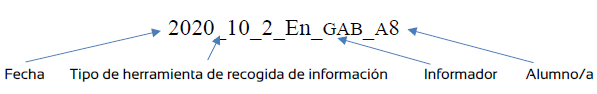 Para codificar la información se utilizaron los siguientes códigos: fecha, tipo de herramienta de recolección de información, informante y alumno/a. En la siguiente figura, se ilustra un ejemplo de una codificación.