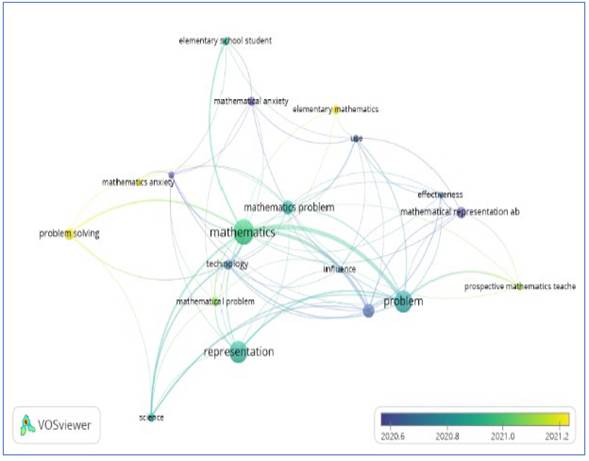Research on math anxiety has been carried out extensively, but studying the anxiety of prospective teachers is still rare. Wahid et al. (2014) conducted research on math anxiety in engineering students. The results of this study indicate that engineering students' math anxiety levels tend to be high. This is because the mathematics content studied in this department is often more abstract and difficult for students. This research aligns with other studies that state most students experience high levels of math anxiety (Akpan, 2022; Bjälkebring, 2019). In terms of problemsolving and mathematical representation, there has been no research that explores the relationship with anxiety levels. This can be seen from the VOS Viewer analysis, illustrated in Figure 3 below: