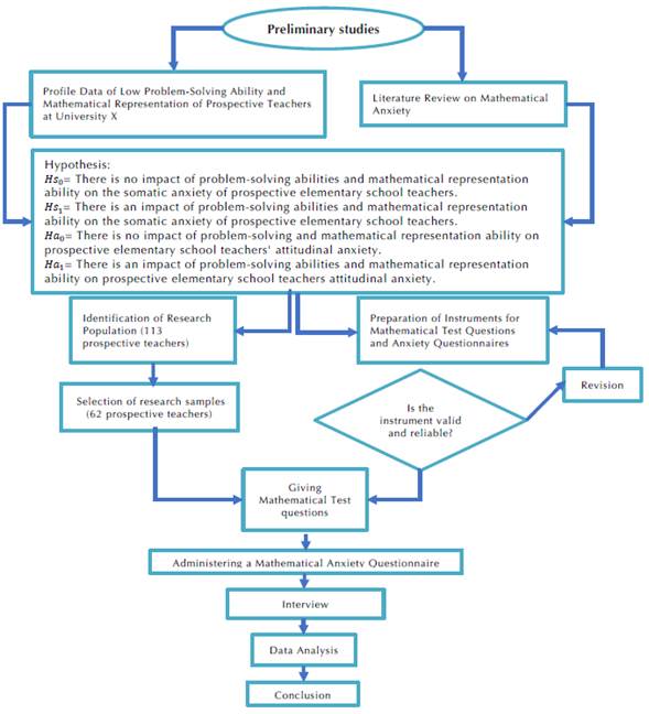 The type of research used is quantitative, with a correlational approach. Correlational research aims to see the relationship between two phenomena to discover new insights (Cresswell, 2012). This research will examine the relationship between problem-solving abilities and mathematical representations with the anxiety level of prospective teachers. The research procedure is illustrated in the following research flowchart: