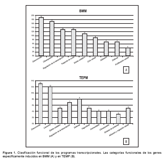 Para tener una idea más clara de la maquinaria transcripcional de cada una de las poblaciones celulares estudiadas, se llevó a cabo un análisis de agrupamiento funcional empleando la ontogenia simplificada del programa GeneSpring v5.1. Las categorías funcionales caracterizadas para cada población indican que los genes expresados en BMM están relacionados con los procesos de adhesión al plástico de las cajas de cultivo que se presentan en estas células.