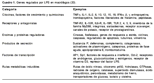 cuadro 1). El espectro completo de los genes inducidos por LPS está siendo analizado y la búsqueda de marcadores de activación así como de genes posibles candidatos para ser blanco de nuevos medicamentos es uno de los principales objetivos.