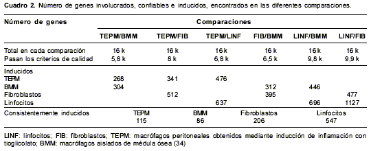 En el trabajo de Ripoll (34), se investigó el programa transcripcional de macrófagos bajo condiciones normales de cultivo (macrófagos aislados de médula ósea - bone marrow macrophages, BMM) y fisiológicas inflamatorias (macrófagos peritoneales inducidos con tioglicolato - thioglycolate-elicited peritoneal macrophages, TEPM) La población de BMM se generó in vitro por medio de la diferenciación de las células progenitoras de la médula ósea con el factor de estimulador de colonias (CSF). La población TEPM está conformada por macrófagos de respuesta inflamatoria, aislados del peritoneo de ratón luego de su estímulo con un agente inespecífico (caldo de tioglicolato). La expresión de estas dos poblaciones se comparó con la exhibida por las células del sistema inmune adquirido (linfocitos) y por fibroblastos. Se aisló el ARN total de todas las muestras y el producto de su retrotranscripción usado como sonda de hibridación de 15.000 cADN presente en chips de los National Institutes on Aging. Las comparaciones directas entre todas las muestras se llevaron a cabo obviando el uso de ARNA de referencia (ARN total de 17,5 dpc de embriones de ratón) que han demostrado no representar un gran grupo de genes expresados por los macrófagos en respuesta a los estímulos inflamatorios (19).