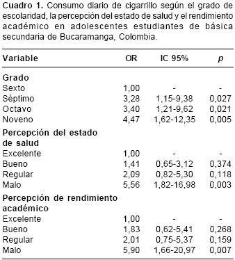 cuadro 1.En lo relacionado con el rendimiento académico, 1,6% (IC95% 0,2 a 2,7) de quienes informaron excelente rendimiento mostraban consumo diario de cigarrillo; 3,9% (IC95% 2,2 a 5,6) de los que manifestaron rendimiento bueno; 4,1% (IC95% 2,1 a 6,1) de los que consideraron su rendimiento regular, y 9,4% (IC95% 3,3 a 15,6) de los que lo anotaron como malo; estas diferencias fueron estadísticamente significativas ( p=0,045). Los OR de prevalencia según el rendimiento académico, tomando como referencia el rendimiento excelente, aparecen en el