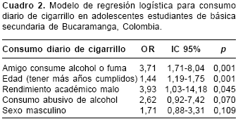 Se concluye que en la ciudad de Bucaramanga, de cada 26 estudiantes, aproximadamente uno, cuyo mejor amigo es fumador o consume alcohol y tiene bajo rendimiento académico, presenta consumo diario de cigarrillo. Es necesario determinar la prevalencia de la dependencia a la nicotina en esta población y diseñar programas de prevención para aquellos adolescentes que no han iniciado el consumo, y de promoción del abandono en los que actualmente fuman, con énfasis en quienes muestran consumo diario de cigarrillo.