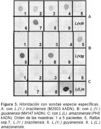 figura 2 muestra los patrones de restricción de las tres cepas aisladas después de la digestión con la endonucleasa Msp I. La muestra 1 (aislamiento de Rattus) presentó un patrón de restricción similar al de L. ( V.) guyanensis (M4147) (línea 5). Este resultado fue confirmado después de la hibridación con sondas para L. ( V.) braziliensis (figura 3A), L. ( V.) guyanensis (figura 3B) y L. ( L.) amazonensis (figura 3C).
