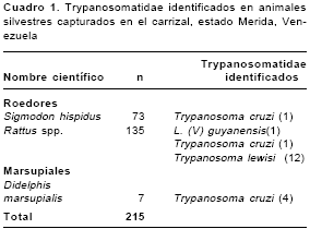 Resultados. Se capturaron y estudiaron 215 animales pertenecientes a tres especies: Rattus spp. (135), Sigmodon hispidus (73) y Didelphis marsupialis (7). Igualmente, se identificaron tres especies de Trypanosomatidae: Leishmania ( V) guyanensis, Trypanosoma cruzi y Trypanosoma lewisi. Mientras T. cruzi fue identificado en D. marsupialis (4/7), S. hispidus (1/73) y Rattus spp. (1/135), L.( V) guyanensis y T. lewisi sólo se identificaron en Rattus spp. (1/135 y 12/135, respectivamente).