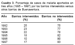 Se analizó la información recogida en Buenaventura de casos de paludismo confirmados entre 1992 y 1997. La tendencia de estos casos en el municipio fue claramente hacia su disminución desde 1994. En los barrios que fueron intervenidos por el INSALPA, la tendencia al descenso fue mayor que en los otros barrios. El aporte proporcional de casos de los barrios intervenidos disminuyó en 8% (25 a 17%) en seis años. Incluso durante 1997, cuando el número de casos de malaria aumentó más allá de lo esperado, estos barrios aportaron menos casos de paludismo (