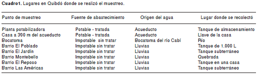 Se recolectaron 8 muestras a la semana por un periodo de 10 semanas, para un total de 80 muestras. Los lugares del muestreo fueron la bocatoma del río Cabí, la planta potabilizadora de agua en Quibdó, una casa seleccionada al azar y cinco barrios del municipio (cuadro 1). En cada punto del muestreo se recolectaron 5 litros de agua en recipientes limpios para un total de 4.000 litros. Debido a que el proceso de potabilización implementado presenta deficiencias, el agua tratada en el acueducto no se consideró como agua potable.