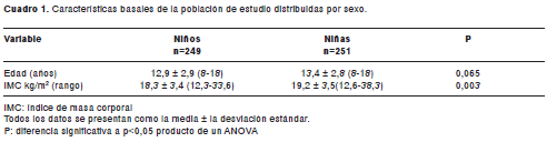 La muestra (500 escolares) para la evaluación de las variables la conformaron 249 varones (49,8%) y 251 mujeres (50,2%), distribuidos así: 112 escolares con edades entre 8 y 10 años (22,4%), 205 entre 11 y 14 años (40,9%) y 184 entre 15 y 18 años (36,7%). El cuadro 1 muestra las características generales de los escolares distribuidos por sexo. Se encontraron diferencias significativas en la edad y el índice de masa corporal entre los sexos, y los promedios fueron de las dos variables mayores en las niñas.