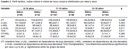 Los datos del cuadro 2 resumen el comportamiento de los lípidos sanguíneos por edad y sexo de los escolares del estudio.