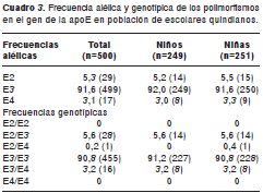 Materials and methods. A sample of 500 children aged 8 to 18 years, were selected from school populations in Quindio Province, Colombia. ApoE genotypes were determined by polymerase chain reaction and restriction enzyme. Lipid profiles were obtained by commercial kits.