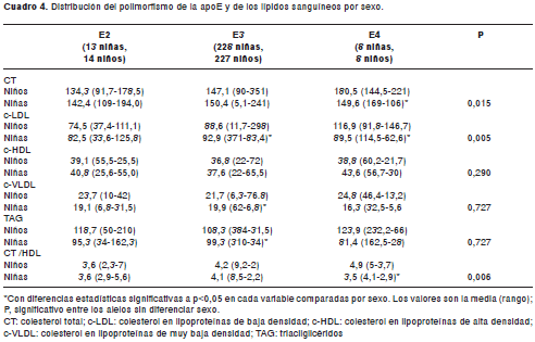 El genotipo apoE y el sexo tuvieron un efecto significativo sobre el colesterol total y el colesterol LDL. En niños, ambas variables se distribuyeron así: E4>E3>E2 (p<0,05); en niñas: E3>E4>E2; el colesterol LDL en niños fue: E2>E4>E3; y, en niñas: E4>E2>E3.