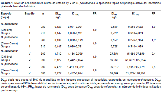 En ninfas de estadio I de las cepas R. pallescens (Chilibre) y R. pallescens (Cerro Cama), se registraron valores de DL50=0,022 ng por insecto y DL50=0,021 ng por insecto, respectivamente. Se observó en ninfas de estadio I de las dos cepas bajo estudio, que no mostraron ninguna diferencia significativa en sus valores de DL50; este mismo comportamiento se encontró con lambdacihalotrina.