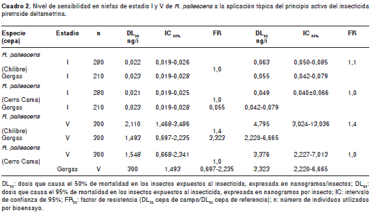 Los resultados del cuadro 2 registran los valores de DL50 y DL95 obtenidos luego de la aplicación tópica en ambas cepas de R. pallescens del principio activo del insecticida deltametrina.