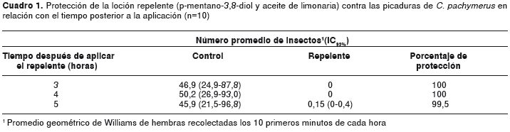 Conclusión. El repelente evaluado demostró una gran eficacia en la prevención de las picaduras de C. pachymerus, hasta cinco horas después de su aplicación.