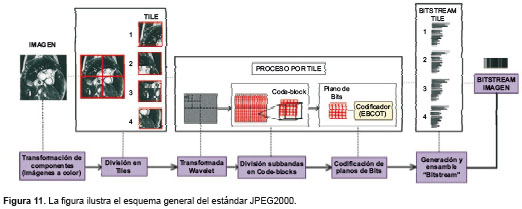 El Embedded Block Coding with Optimized Truncation , más conocido como EBCOT, es el motor central de codificación en el estándar de compresión de imágenes JPEG2000. En este estándar, como primera medida, la imagen es transformada con una descomposición wavelet ; en un paso posterior, esta transformación permite dividir cada subbanda´ en bloques relativamente pequeños, con dimensiones típicas de 64 x 64 o 32 x 32 muestras cada uno. Cada bloque de código se codifica de manera independiente, produciendo un bitstream embebido con muchos puntos de truncamiento (figura 11).
