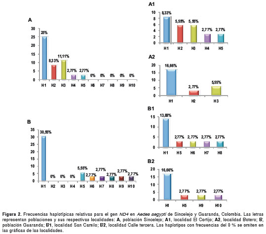 Según la red haplotípica y teniendo en cuenta la alta frecuencia del H1 en las dos poblaciones, es posible inferir que este fue uno de los primeros haplotipos introducidos y posteriormente disemi-nado en el departamento de Sucre (figura 2). La presencia de este haplotipo en Brasil (14), Perú (16), México (39) y Kenia (24), permite suponer que este linaje geográfico fue introducido al país desde el continente africano, posiblemente a través de Europa cuando se llevaron a cabo las primeras exploraciones y colonizaciones europeas (40). El H5 registrado en muy baja frecuencia en Sincelejo y Guaranda, no se encontró en la localidad de Botero; esta última ha estado sometida a presión constante con insecticidas organofosforados y piretroides, que se han utilizado en la localidad durante brotes epidémicos, y además, en ella se reporta resistencia al temefós (38).