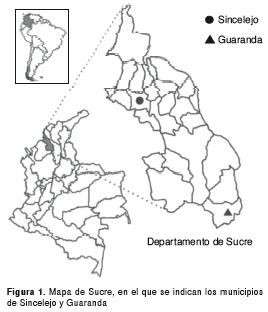 Las condiciones ecológicas de Sincelejo (09°18' N, 75°25' O), subregión sabanas, corresponden a bosque seco tropical, con promedios anuales de temperatura y humedad relativa de 27,5 °C y 80 %, respectivamente, y una precipitación media que oscila entre los 1.000 y 1.200 mm por año. Por sus características climáticas, el municipio de Guaranda (08°28' N, 74°32° O), subregión La Mojana, es clasificado en la zona de vida de bosque húmedo tropical, con promedios anuales de temperatura, humedad relativa y pluviosidad de 28 °C, 85 % y 2.800 mm, respectivamente. La distancia geográfica entre estas dos poblaciones es de 136 km, aproximadamente, estimada con el programa Google Earth 4.2.0198 Beta (9).