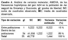 Materials and methods: Genetic material extracted from 36 females of Ae. aegypti was used to determine the partial sequence of the mitocondrial gene ND4 as well as to estimate the parameters of nucleotidic and haplotypic diversities, genetic structure and gene flow between the Sincelejo and Guaranda populations. The molecular variance was also analysed and a haplotypic network constructed.
